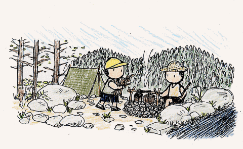 | 昔々、あるところに、SくんとMくんという兄弟がいました。夏休みも後半だというのに、ふたりとも宿題はちっともしないで、遊んでばかりいましたが、今回もSくん(兄)が、「ふたりだけで、キャンプに行こうぜ。」と悪だくみをもちかけました。 |