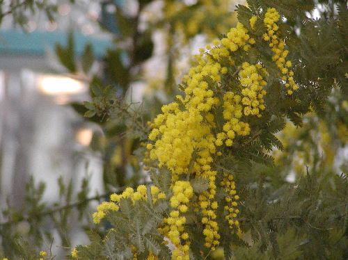| 早春の白梅の時期が過ぎ、桜の花にはまだすこし早いこの頃、街のあちこちでミモザの花を見かけるようになりました。近くで見ると、繊細でちいさな黄色い花なのですが、遠くからながめると、そこだけ光が集まったように、明るく輝いています。 | ||||