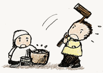 子供の頃は、↑こんな光景が町(村)のあちこちで見られました。近所の家(りんぽと言っていた)何軒かが集まって、家族総出で、お米を蒸したり、ついたり、伸ばしたり。風は冷たかったけど、辺りには、お母さんや子供たちの笑い声と、ぺったんぺったんという「年の瀬の音」が鳴り続けていたのでした。